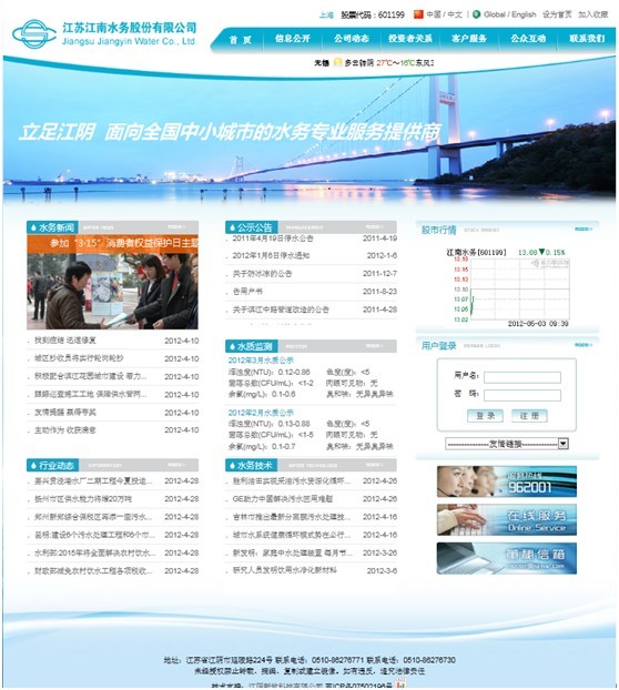 在欄目設(shè)置和內(nèi)容上,進(jìn)行了重新組合,新網(wǎng)站保留了原網(wǎng)站的信息公開、公司動(dòng)態(tài)和客戶服務(wù)模塊;行業(yè)動(dòng)態(tài)和水務(wù)技術(shù)繼續(xù)沿用水網(wǎng)的接口,使網(wǎng)站具有最新的水務(wù)資訊。首頁新增了股市行情模塊,實(shí)時(shí)的展現(xiàn)公司股票(證券代碼:601199)的最新行情;新增了“投資者關(guān)系”欄目,及時(shí)準(zhǔn)確地為投資者提供投資信息。同時(shí)針對(duì)客戶日益增長的網(wǎng)上服務(wù)需求,新網(wǎng)站更新了水費(fèi)查詢系統(tǒng),該系統(tǒng)與公司營銷系統(tǒng)對(duì)接,準(zhǔn)確實(shí)時(shí)地為客戶提供用水清單和用水趨勢(shì)圖。并與公司的服務(wù)熱線962001實(shí)現(xiàn)無縫對(duì)接,及時(shí)處理客戶的投訴、咨詢與報(bào)漏報(bào)修等。網(wǎng)站還開設(shè)了公眾互動(dòng)功能,讓客戶更好地了解水、了解水公司。