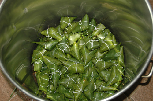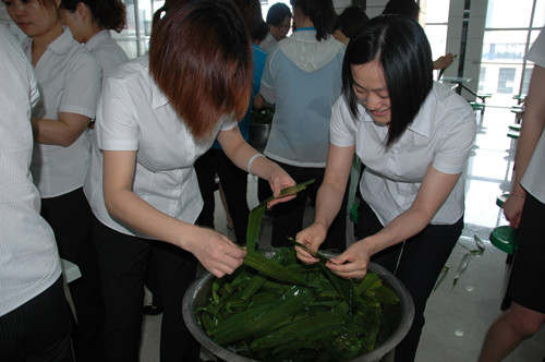 挑選3-4張?zhí)J葦葉交錯(cuò)疊開,將葉子圍成圓錐狀,放進(jìn)大米花生,包蓋圓錐口,用手攥出棱角,再拿一張粽葉包裹住露出的口子,用繩子扎緊,一個(gè)粽子就完成了?戳藥状位菊莆詹襟E,大家也躍躍欲試,可實(shí)踐往往沒有想象的那么簡(jiǎn)單,米裝得太松裹不緊,米裝得太多或者壓得太緊又容易把粽葉弄破,好不容易把粽葉包好了,最后封口又是一道難關(guān),捆綁時(shí)手稍微一松粽子就散開了!叭绻衲暝賹W(xué)不會(huì)又要等下次活動(dòng)啦,這次一定要成功!”有些員工已不是第一次參加,或許她們包的并不好,但她們那股認(rèn)真、執(zhí)著的勁頭值得贊揚(yáng)。隨著大家的“埋頭苦干”,粽葉漸漸減少,桶里滿滿地堆起大家的“心意”。