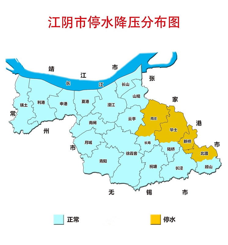 停水范圍 :周莊鎮(不包括長壽)、華士鎮(不包括陸橋)、新橋鎮和北漍社區所有用戶停止供水。